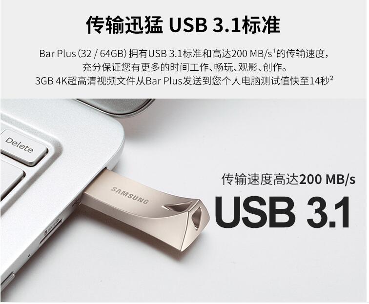 三星優(yōu)盤(pán)64GB USB3.1 U盤(pán) BAR升級(jí)版+高速汽車(chē)載歌曲金屬外殼精致